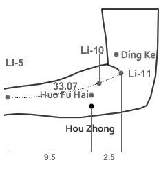 2 צון דיסטלית ו 1 צון אולנרית ל- Li11 בין ערוץ ה- Yang Ming ל- Shao Yang של היד.