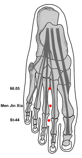 - דלת המתכת התחתונה Mén jīn xià 門金下 מיקום בין עצמות המטאטרסליות 2-3, 0.5 צון מהמפרק שבין הפלאנגיאל והמטאטרסל, הנקודה נמצאת 0.5 צון פרוקסימלית מ St-44.
