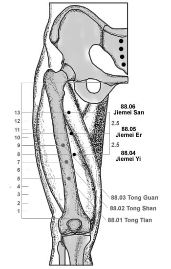 - 88.04 Jiemei Yi נמצאת צון מדיאלית וצון סופריורית ל- 88.02 Tong Shan, הנקודה נמצאת 8 צון מעל הפטלה.