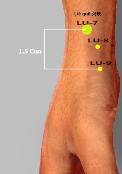 כאשר האצבע המורה והאגודל של שתי הידיים מוצלבים והאצבע המורה מעל ה- styloid process של הרדיוס. הנקודה נמצאת בשקע מתחת לאצבע המורה בין שתי הגידים.