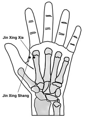 - Jin Xing Shang – בצד הרדיאלי של אצבע השניה, באמצע של ראש העצם של המטאקרפלית. או בסוף קו החיים על כף היד